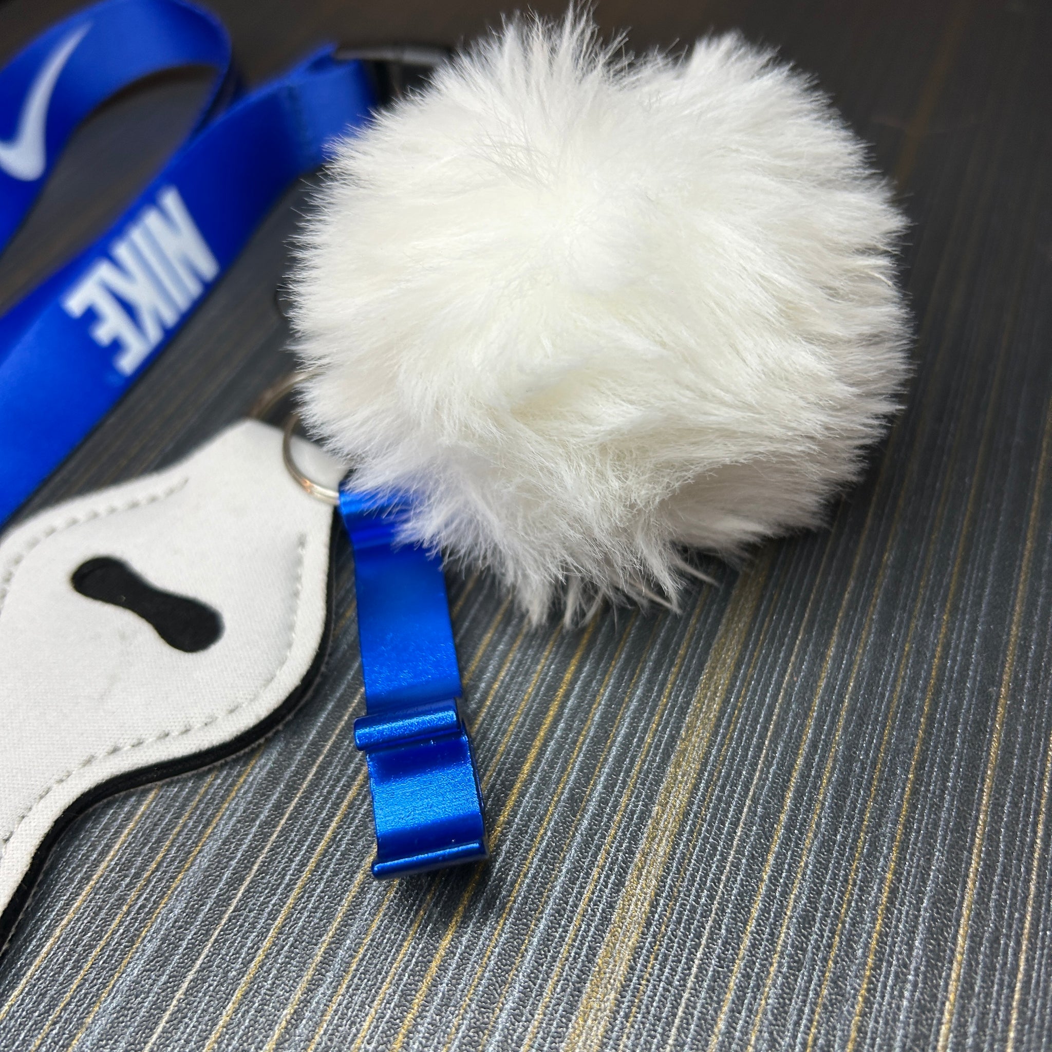 Add a sporty touch to your keys or bag with this Nike lanyard, complete with a fluffy white pom pom keychain and a convenient chapstick holder. Keeps your essentials organized and easily accessible.
