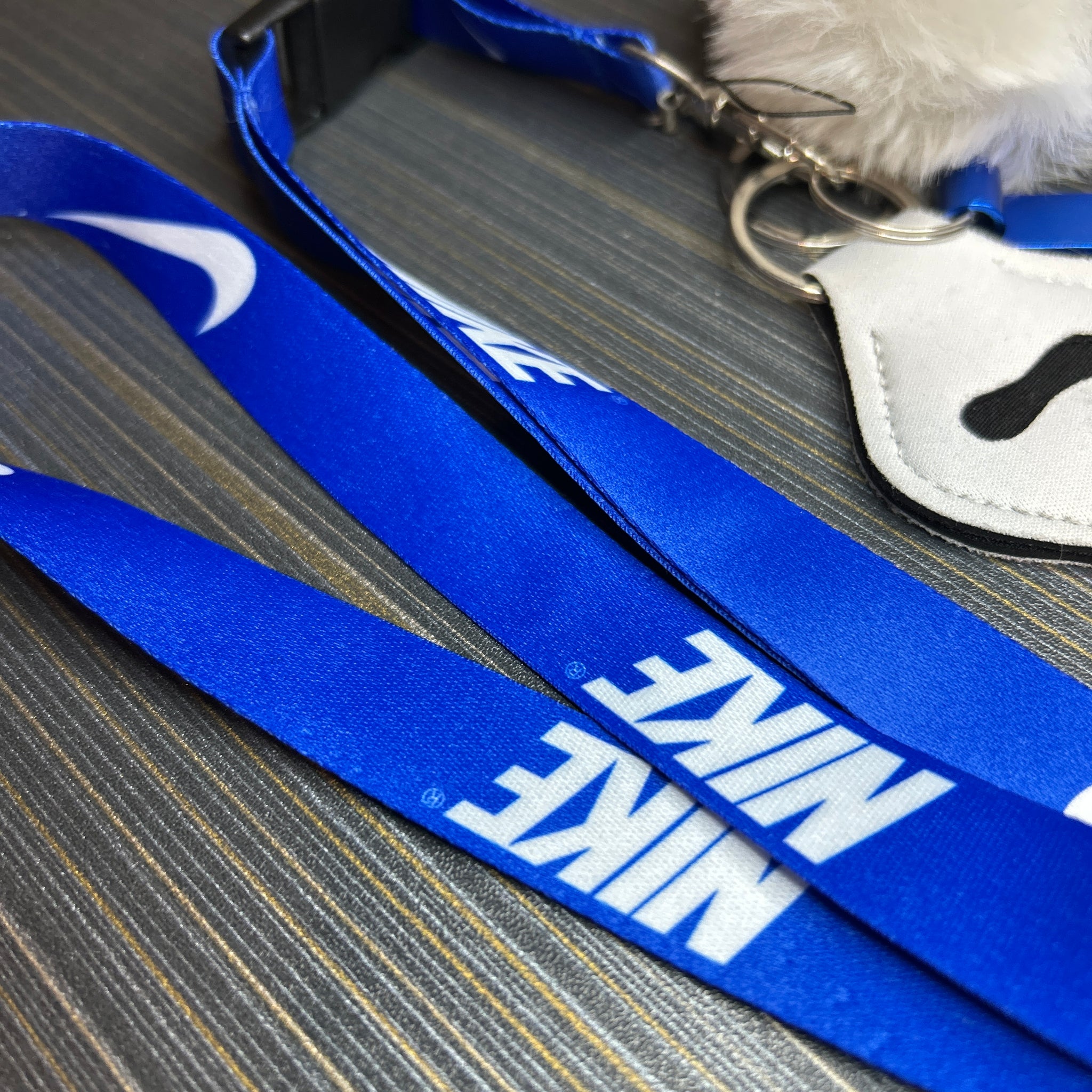 - *Lanyard:* Blue fabric with white Nike logos and a sturdy black clip